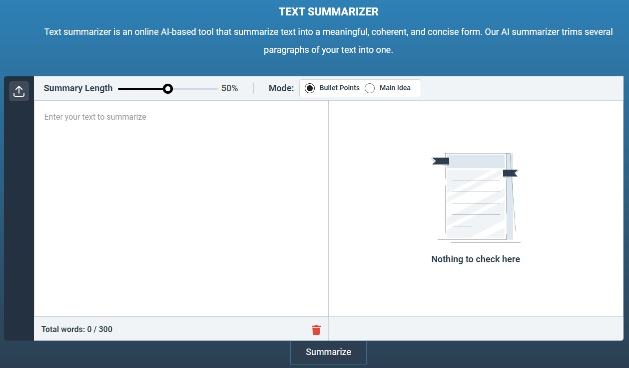 The summarizing tool by Check-Plagiarism.com is a quick solution to extract the main points from a document. Its algorithms are highly efficient at distinguishing between the essential and less important details. The tool generates a precise summary enriched with core information using these algorithms. So, you can use this text summarizer to instantly get key insights into a document.