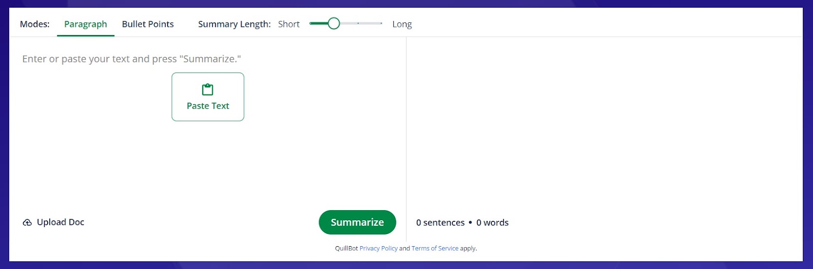 All you need to do is upload the reference document to the tool and set the intensity of summarization. After that, the summarized version of the file will appear instantly on your screen when you press the “Summarize” button.
